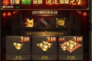 活动一:元宝转盘活动时间:2020年5月30日0:00-6月2日23:59活动范围:开服时间小于7天(包含7天)不参与本次活动活动说明:活动期间,充值指定金额即可获得转盘机会,投资元宝即可返还大量元宝