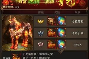 活动一:每日充值送金币,转生精魄,骑宠果实每日充值返高额比例金币!超高返还比,超值礼包不限量放送,机会不容错过!活动时间:2020年5月19日00:30-5月22日23:59活动内容:活动时间内,每日