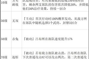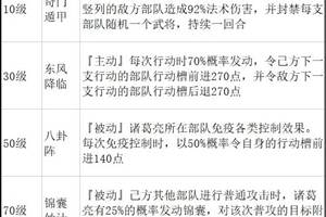 武将名称:诸葛亮诸葛亮,字孔明,号卧龙。蜀汉丞相、第一谋士,计出隆中,天下遂三分;刘备病逝后,诸葛亮辅佐后主,六出祁山意欲恢复中原,最后病逝于五丈原。武将模型:武将专属神兵:武将技能: