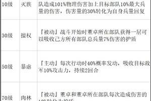 武将名称:董卓董卓,字仲颖,东汉末权臣。曾挟令天子,独揽大权,袁绍因此联合关东各地刺史、太守起兵讨伐董卓。后被孙坚击败退守长安,最终被其亲信吕布所杀。武将模型:武将专属神兵:武将技能:
