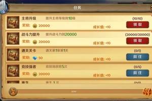 酒馆(2级开放)每天普通免费5次抽取道具,高级的每天免费一次英雄升级(4级开放)经验书——使用经验书可以快速提升英雄等级装备强化(6级)使用金币可对武将装备进行强化,还能提升战斗力,获得额外基础属性英