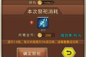 功能简介:法阵祭祀,提供玩家升级整体实力的地方,可以通过使用金币来提升伤害和生命属性百分比,增加的属性对全部上阵的部下都有效。开启条件:通关第七章第十二关开启玩法介绍:祭祀需消耗金币和神之祭品道具,每